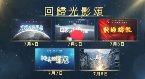 为祝贺香港回归25周年,TVB特别推出“香港回归25周年献礼”,当中包括戏剧及综艺节目。《回归光影颂》剧集系列一共有五个单元剧及一套十五集连续剧,并已于7月4日起,逢周一至周五晚上八点半TVB翡翠台与埋堆堆同步播出,此前播出的《究竟天有多高》《母亲的乒乓球》《我的骄傲》三部单元剧都获得不俗的收视和口碑。